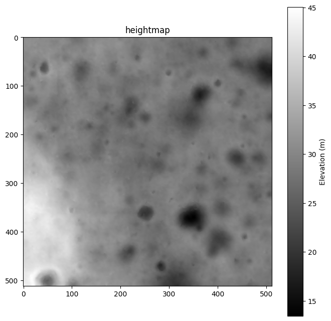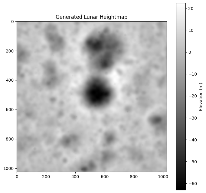This project is a procedural lunar terrain heightmap generator for Python. The algorithm is grounded in established models of lunar geology and crater formation, generating realistic terrain at a scale of 1 meter per pixel.